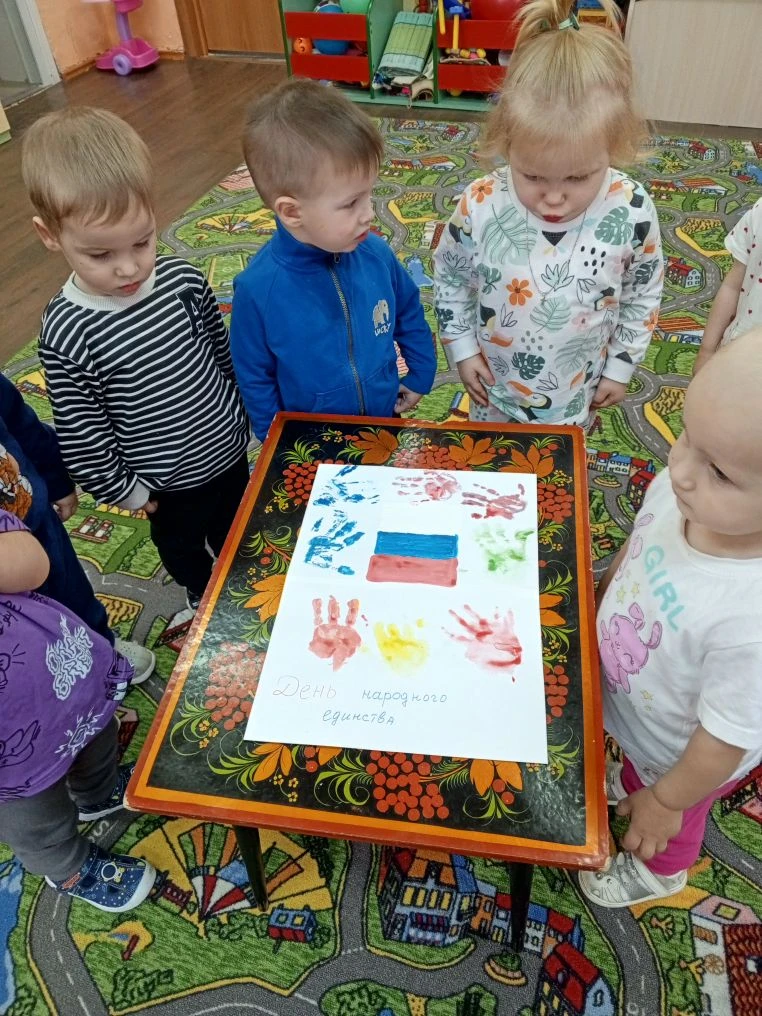 В первой младшей группе, прошла беседа о празднике "день народного единства." дети узнали о символике России. Рисовали "моя ладошка".. Играли в игру '"моя Россия. "