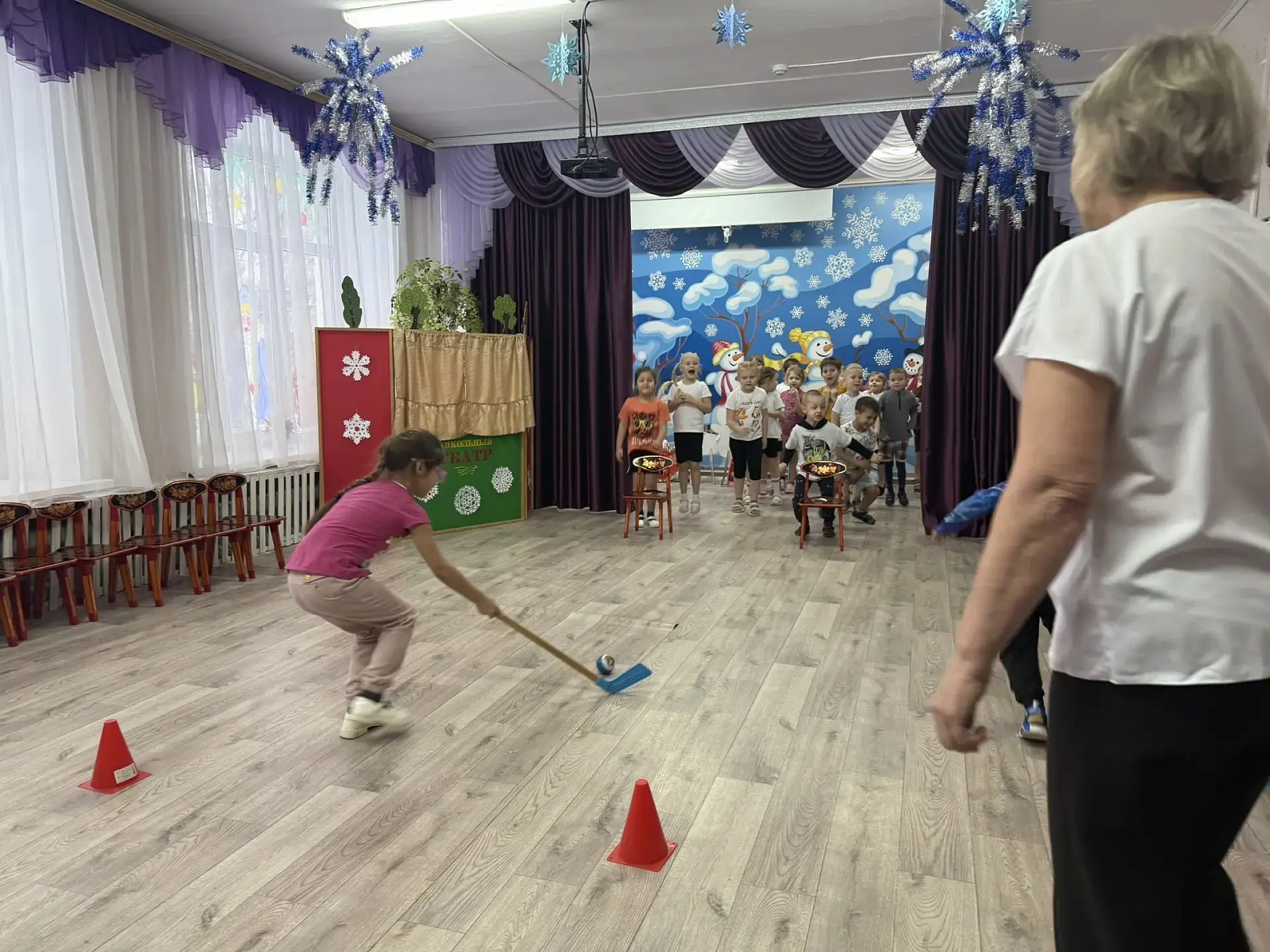 Дошкольники с радостью и ловкостью метали снежки, учились играть в хоккей с мячом и катить обруч!