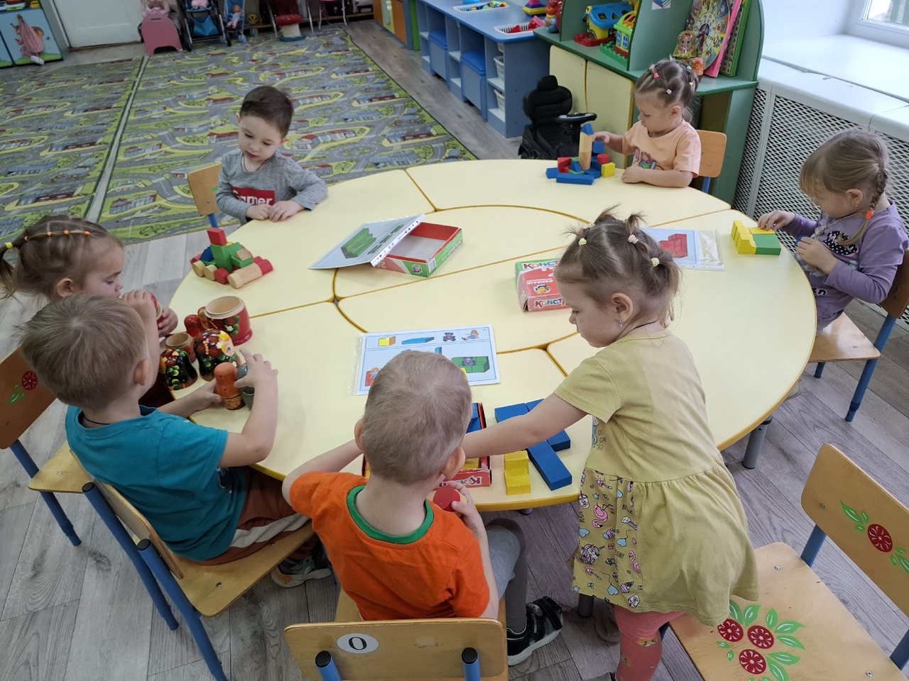 Дети учились строить из деревянного конструктора мебель. Многие малыши конструировали по схемам и рисункам мебель, а некоторые ребята подошли к работе творчески, креативно и построили для матрешек машины, дома и замки.