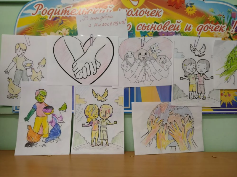 В средней группе организованна выставка рисунков "В мире милосердия и добра". Цель: формировать у детей представление о добре, милосердие, сострадания и взаимопомощи.