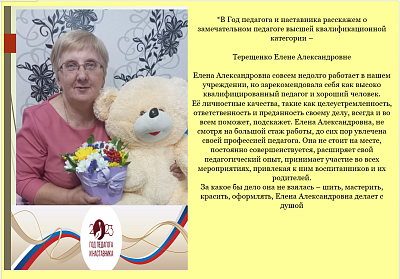 Её личностные качества, такие как целеустремленность, ответственность и преданность своему делу, всегда и во всем поможет, подскажет. Елена Александровна, не смотря на большой стаж работы, до сих пор увлечена своей профессией педагога. Она не стоит на месте, постоянно совершенствуется, расширяет свой педагогический опыт, принимает участие во всех мероприятиях, привлекая к ним воспитанников и их родителей.