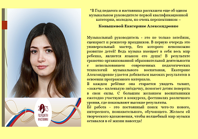 Музыкальный руководитель - это не только затейник, сценарист и режиссер праздников. В первую очередь это универсальный мастер, без которого невозможно развитие детей! Ведь музыка вмещает в себя весь мир ребенка, является языком его души! В результате грамотно организованной образовательной деятельности с использованием современных педагогических технологий музыкального воспитания, Екатерине Александровне удается добиваться высоких результатов в освоении программного материала.