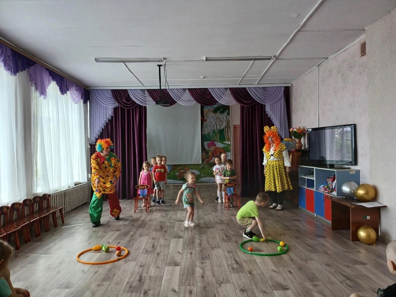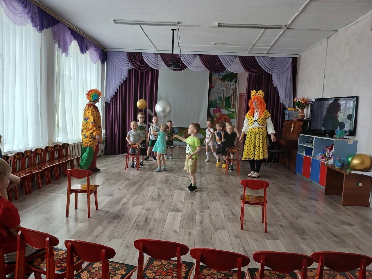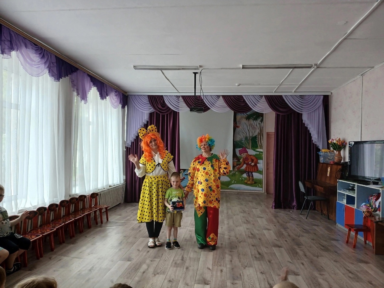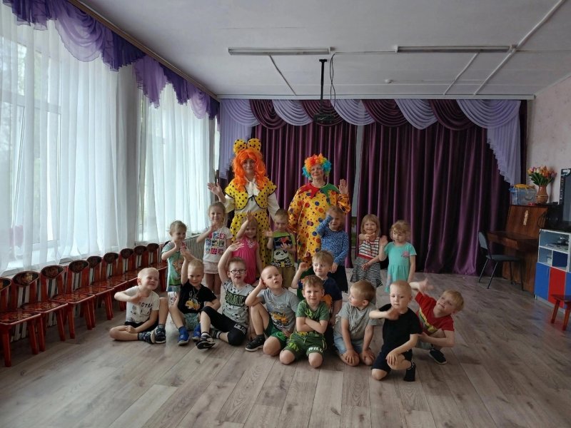 Поздравить его пришли клоуны Клёпа и Ириска. Они играли с детьми, танцевали, водили каравай. Закончилось всё подарком имениннику и весёлым чаепитием.