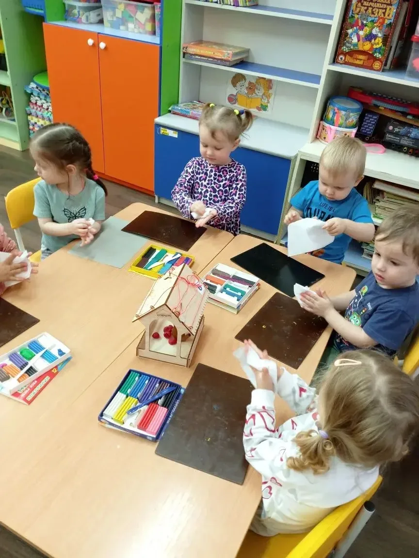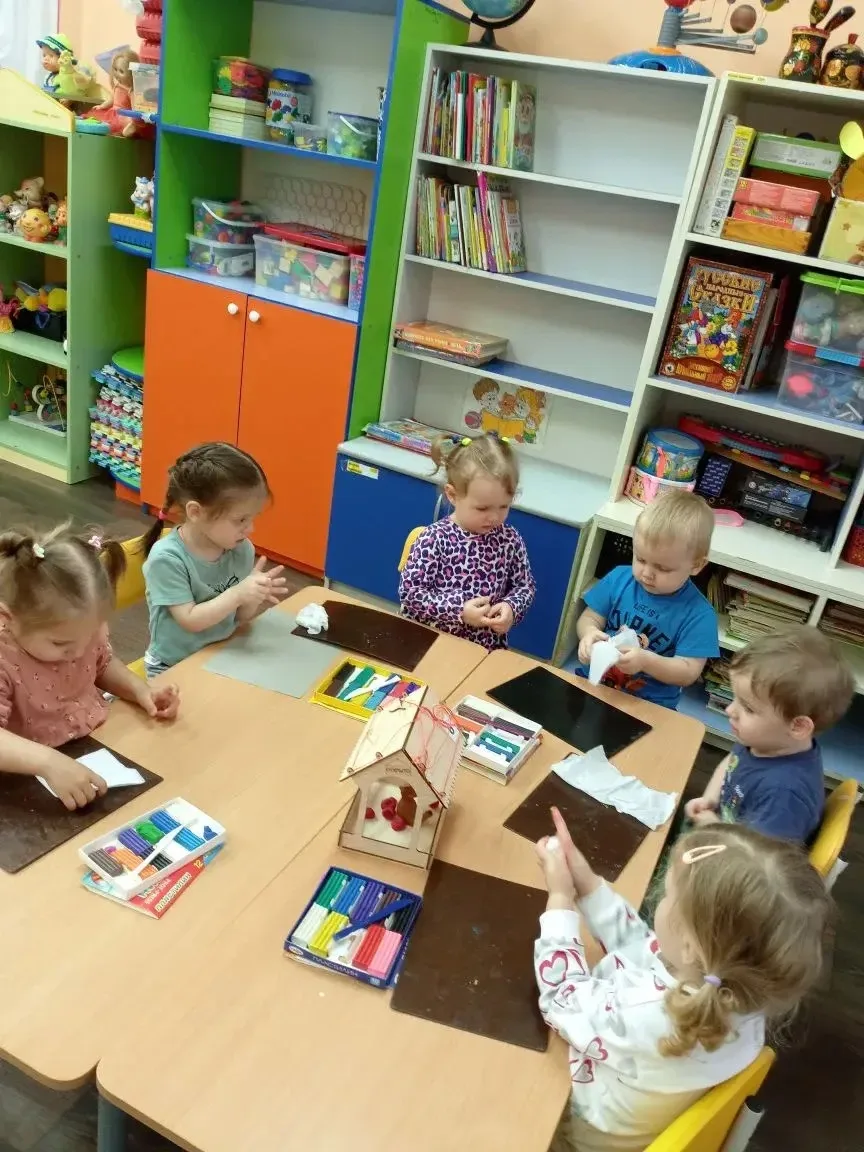 На одном из занятий они решили помочь птичкам и слепили для них много ярких и красивых ягод из пластилина. Малыши старательно катали шарики-ягодки и раскладывали их в домик для птичек.