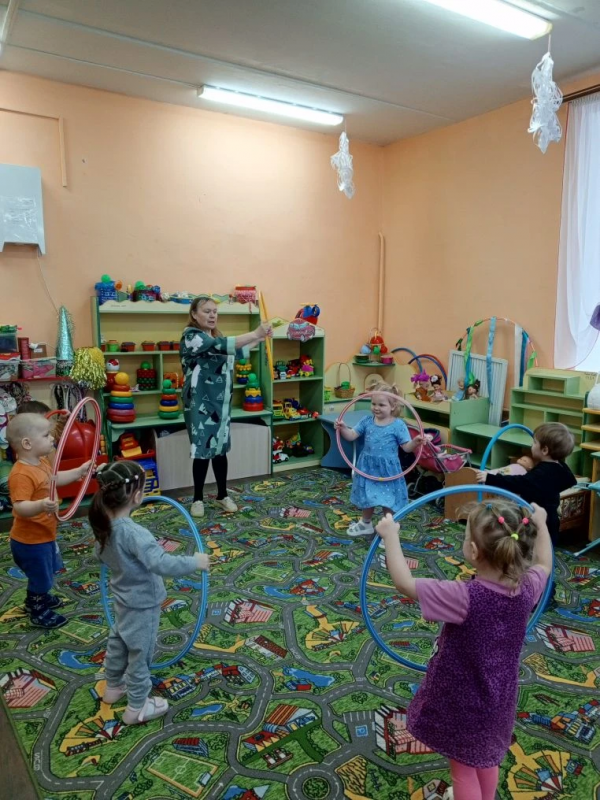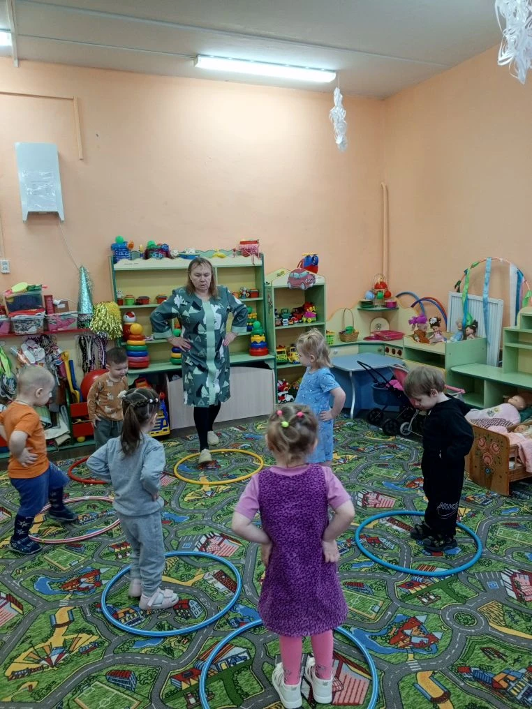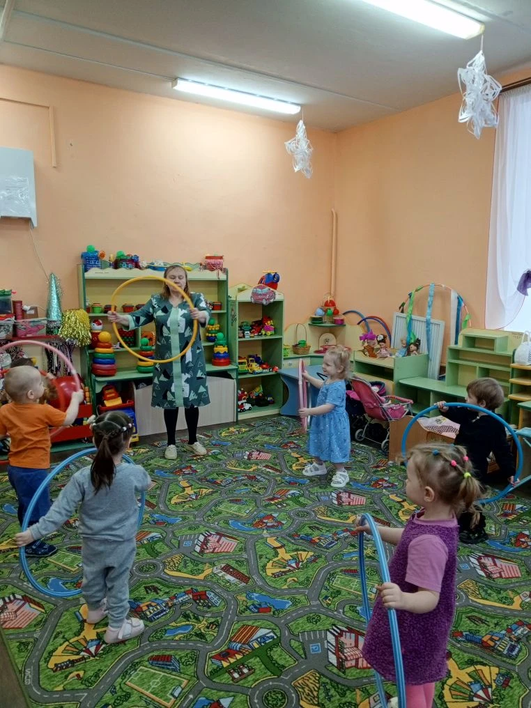 В первой младшей группе. Прошёл весёлый праздник. Дети выполняли упражнения с обручами. Играли в игру "такси". Игровое упражнение "к кукле в гости. Ребята были активными и весёлыми.