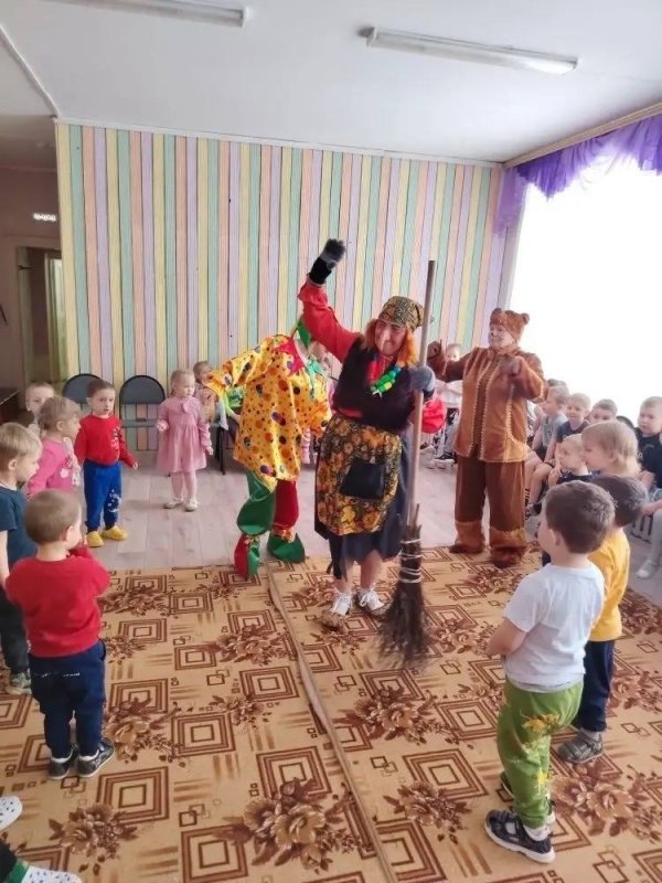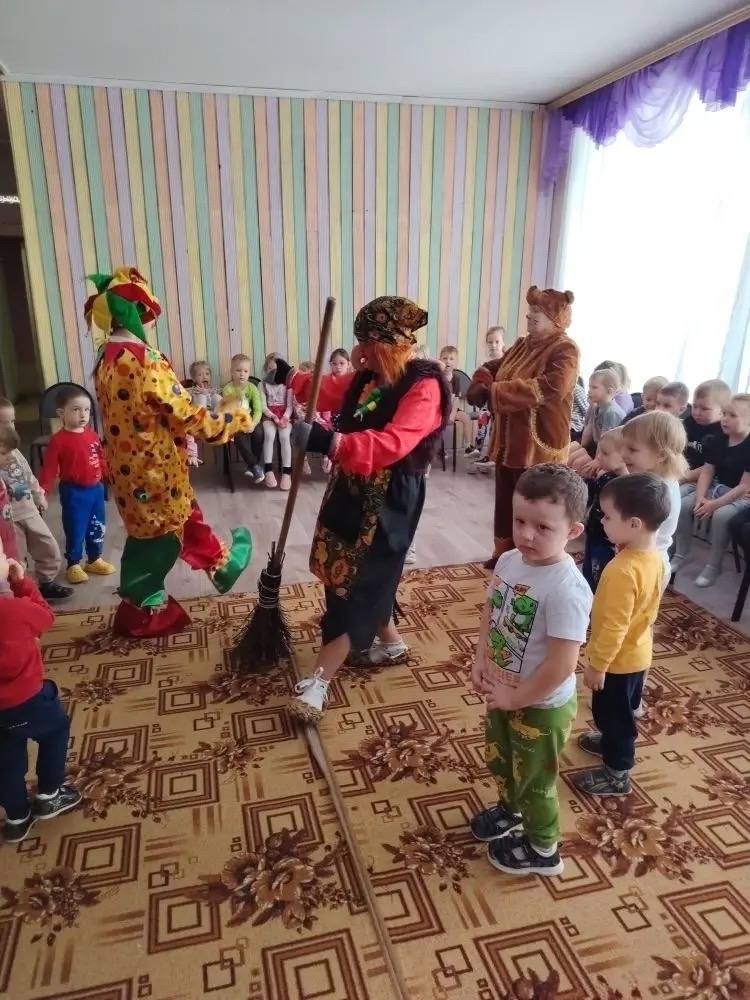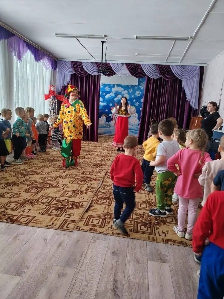 Любимые персонажи детей – Скоморох, Медведь и Баба Яга устроили весёлые масленичные забавы: ребята играли в различные игры, участвовали в конкурсах, водили хороводы. Главным заводилой, конечно же, был озорной Скоморох, который шутками и прибаутками поднял настроение и детям, и взрослым. Он не только развлёк, но и рассказал о масленичных традициях и символах этого светлого праздника.