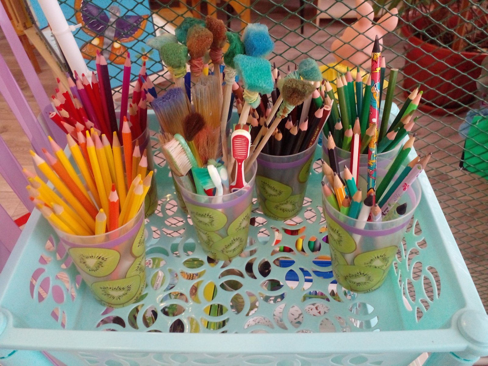 -Гуашевые и акварельные краски, кисти разной толщины, палитры, стаканчики-непроливайки, подставки для кистей.