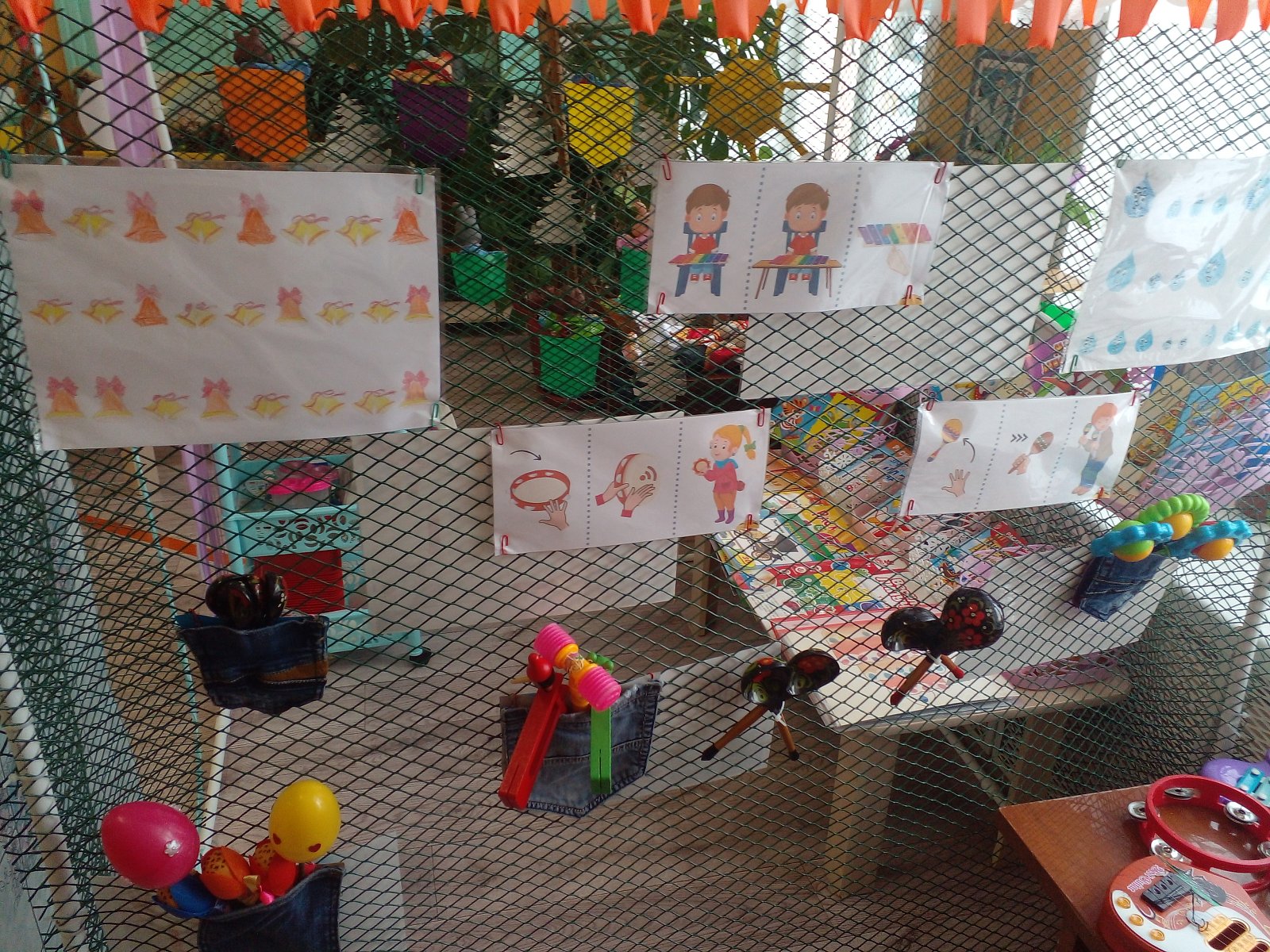 На правой боковой стенке домика располагается музыкальный уголок. В джинсовых кармашках находятся музыкальные инструменты и схемы использования музыкальных инструментов( музыкальные рисунки).
